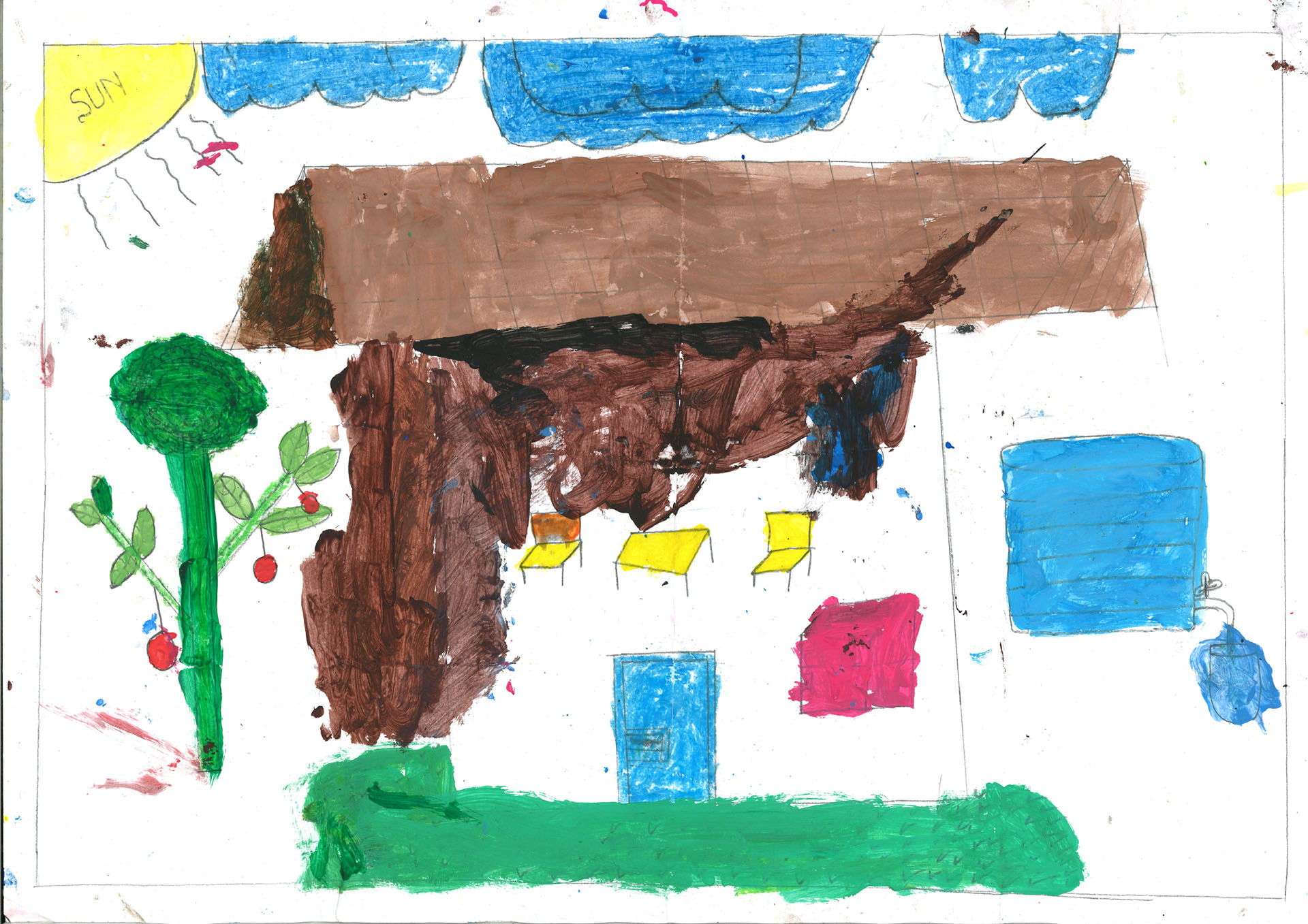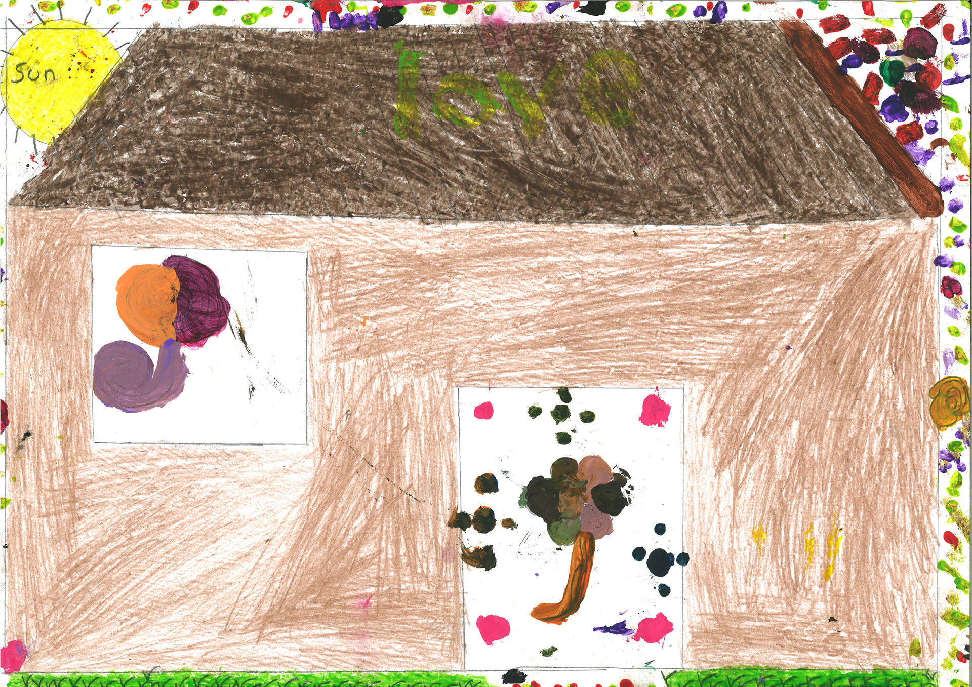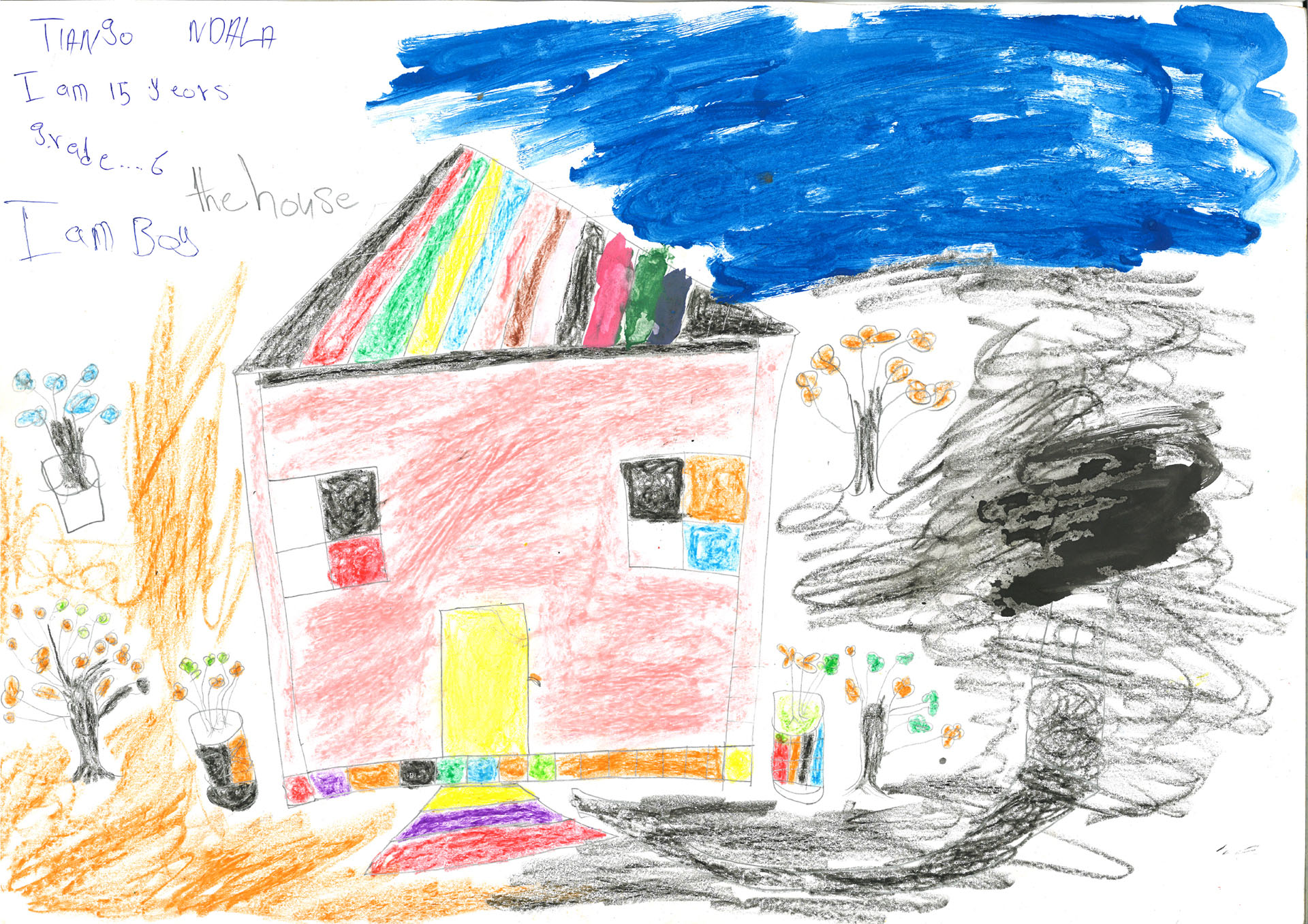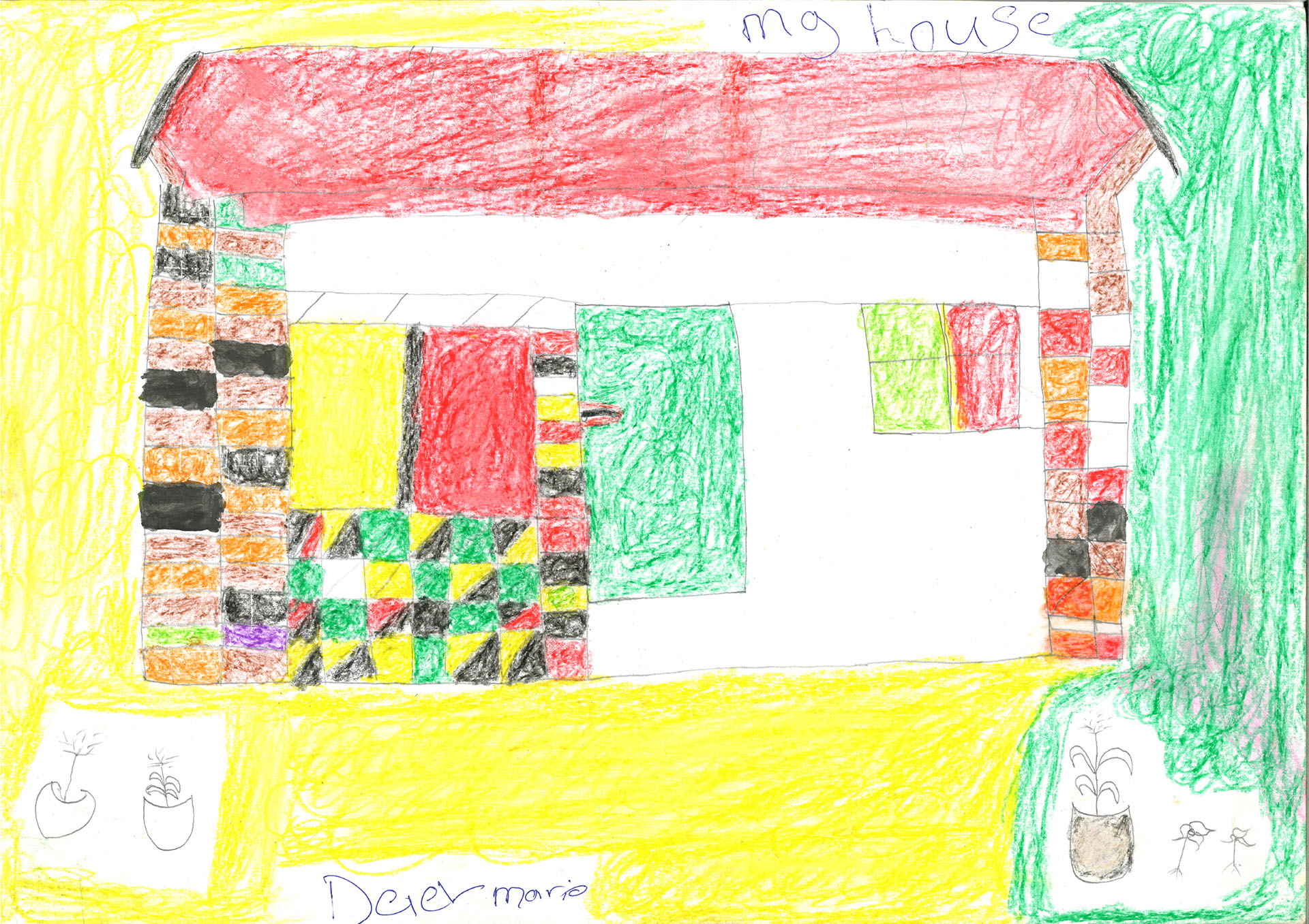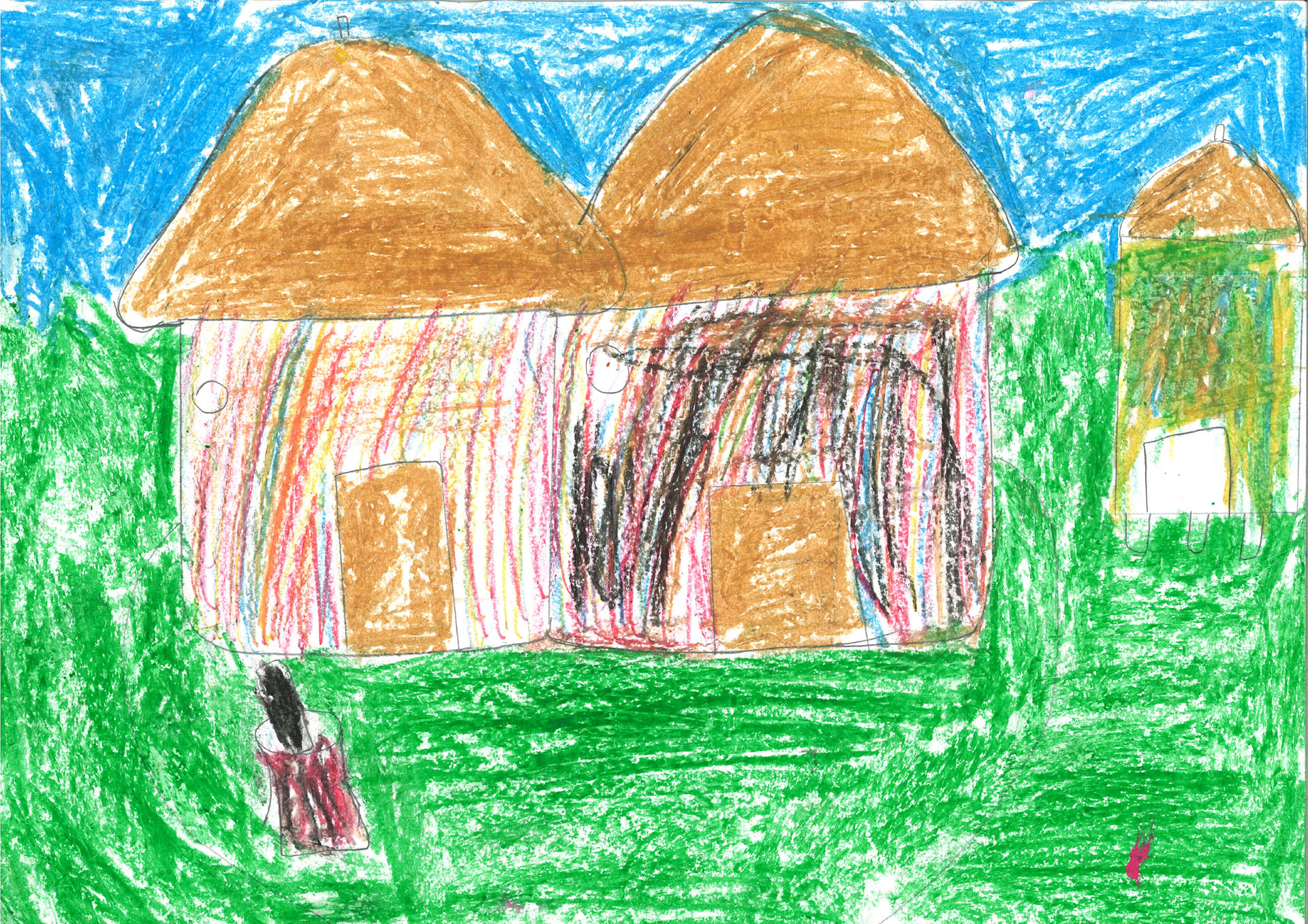 ザンビアの、自国から逃れてきた難民の子どもたちが家族や友達という「人」を描くことが多いのに対し、やっと定住できた子どもたちが「家」を多く描いていることも興味深いです。