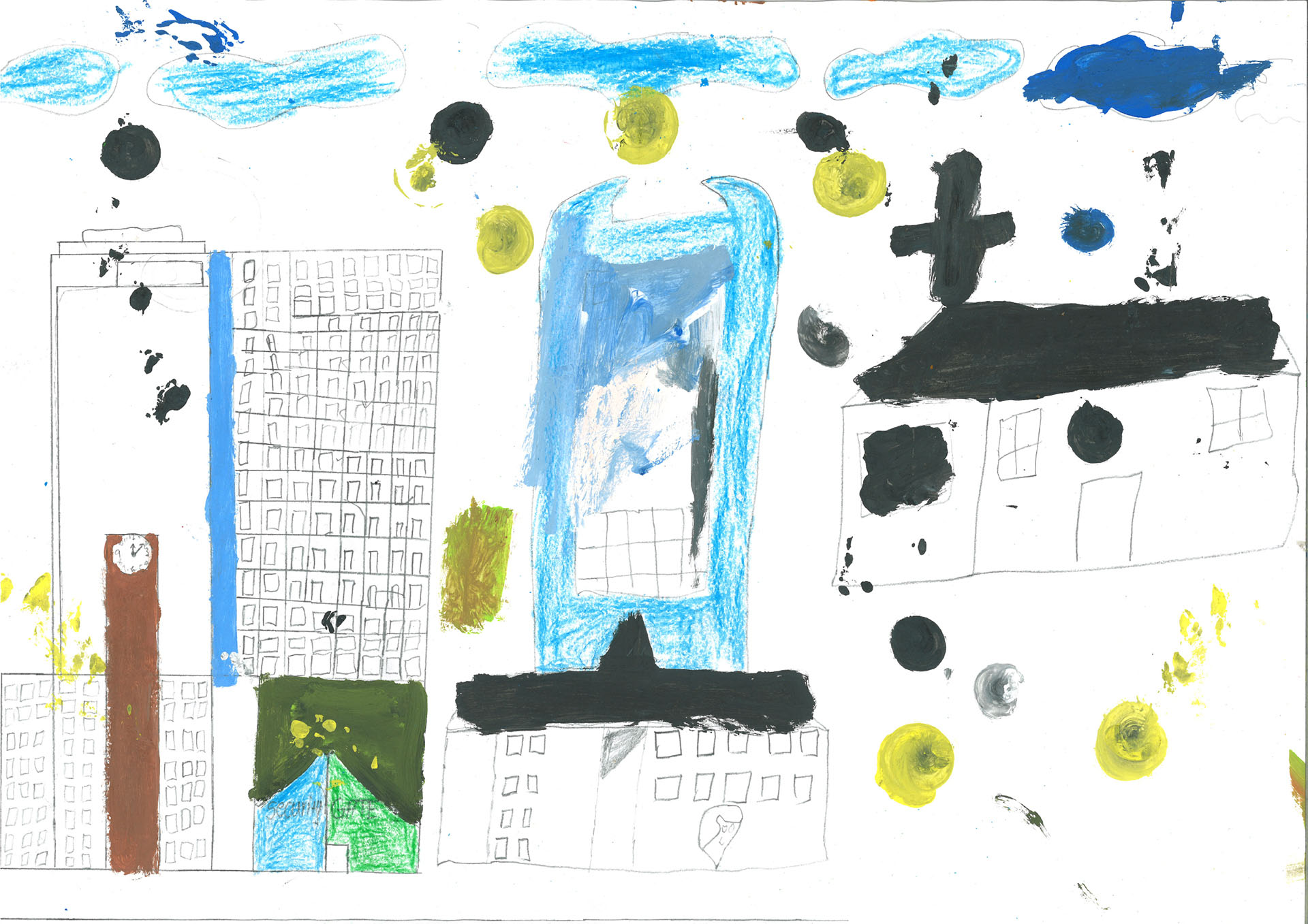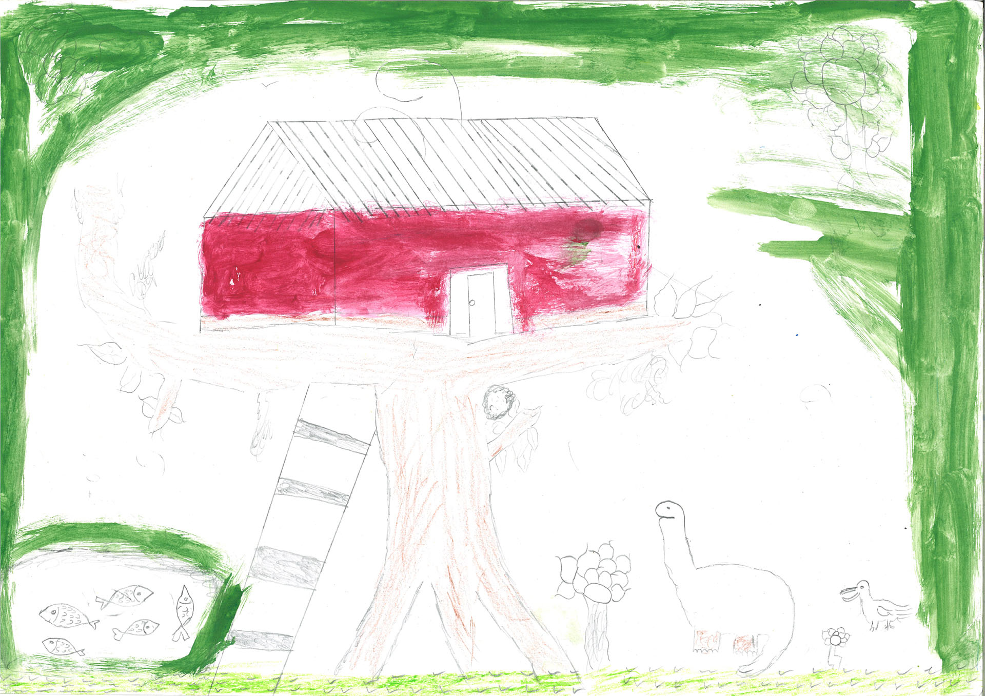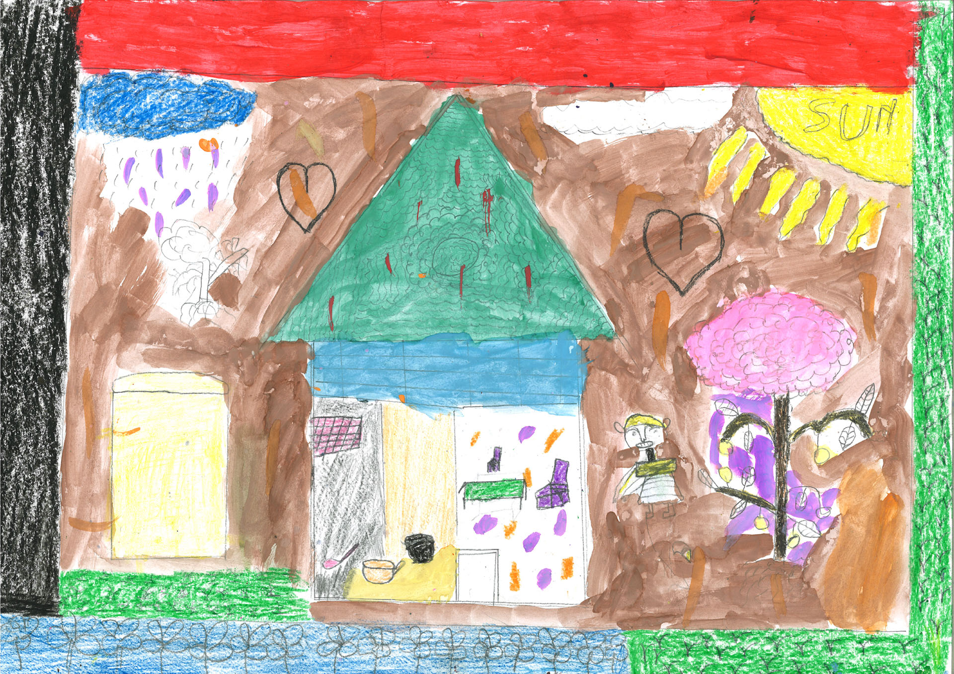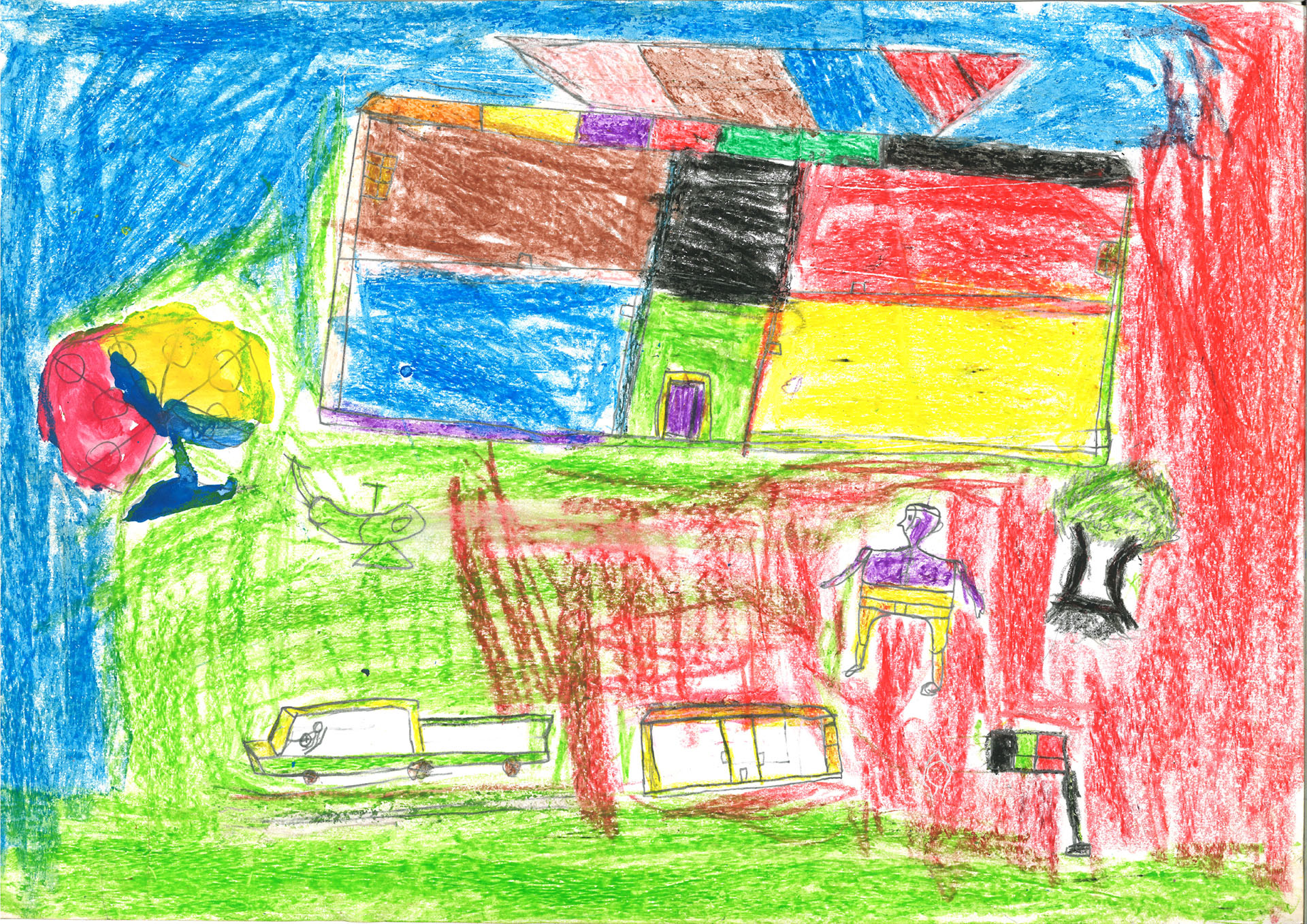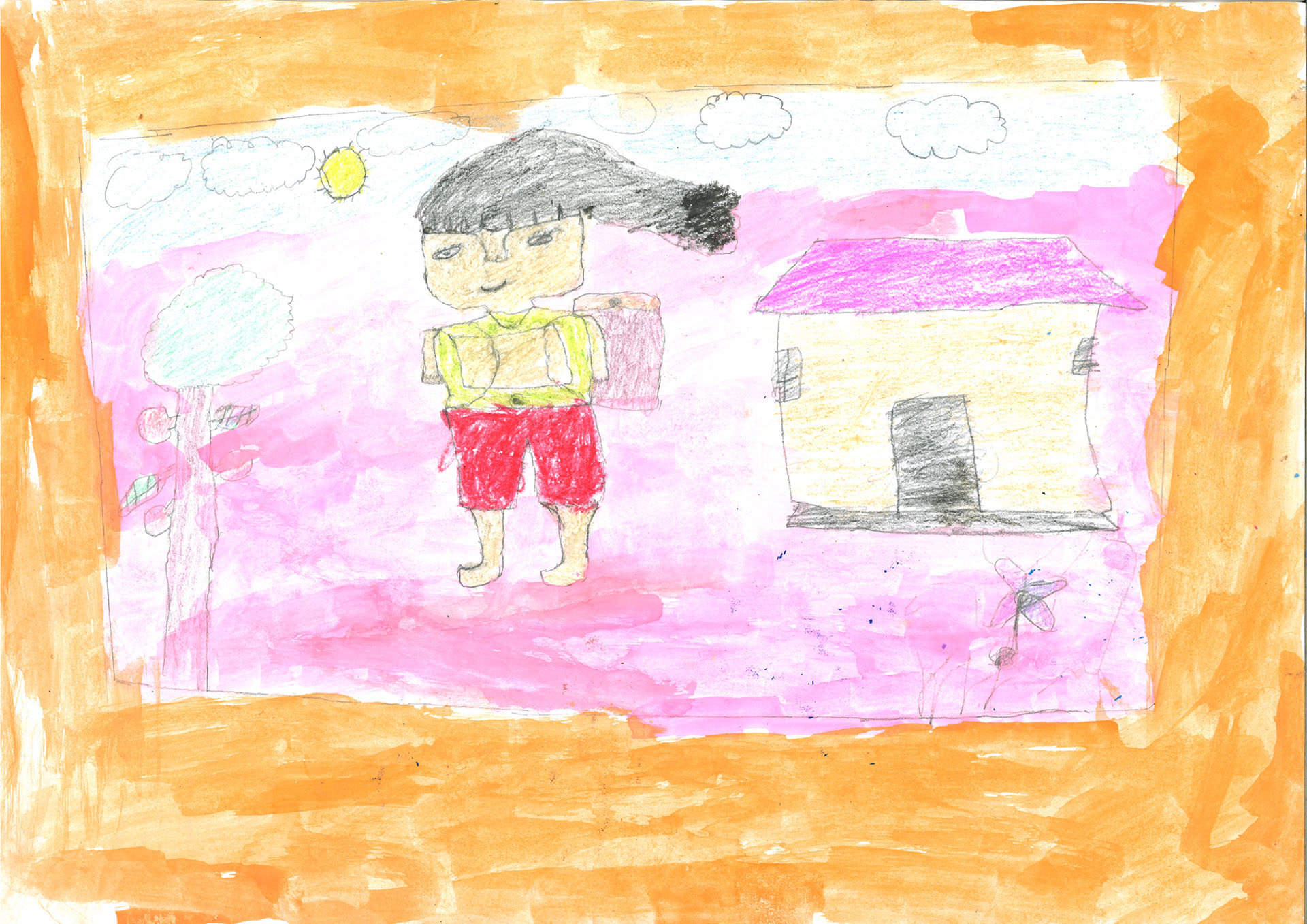 ザンビアの、自国から逃れてきた難民の子どもたちが家族や友達という「人」を描くことが多いのに対し、やっと定住できた子どもたちが「家」を多く描いていることも興味深いです。