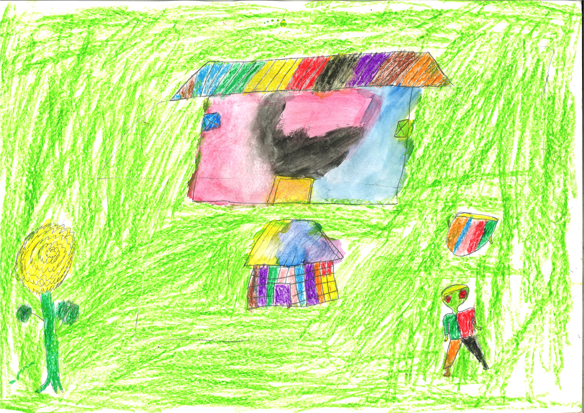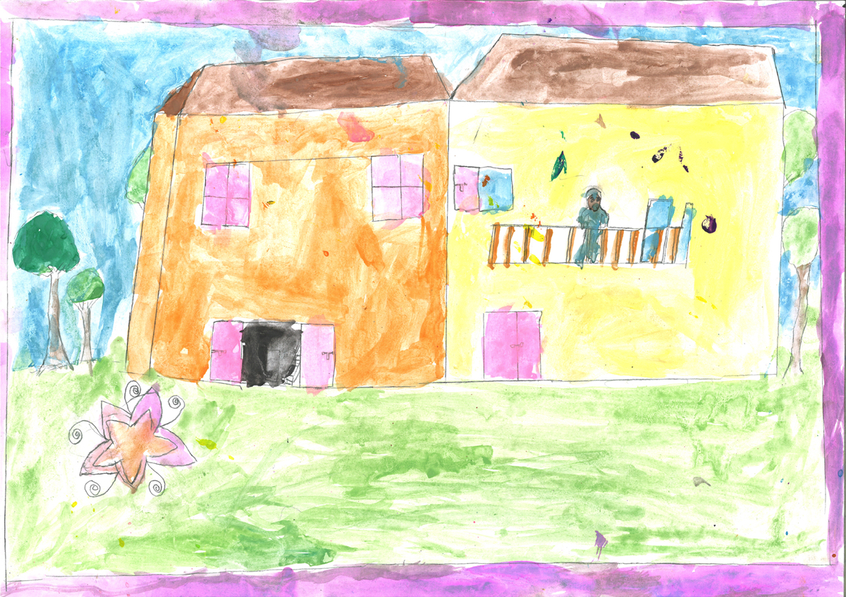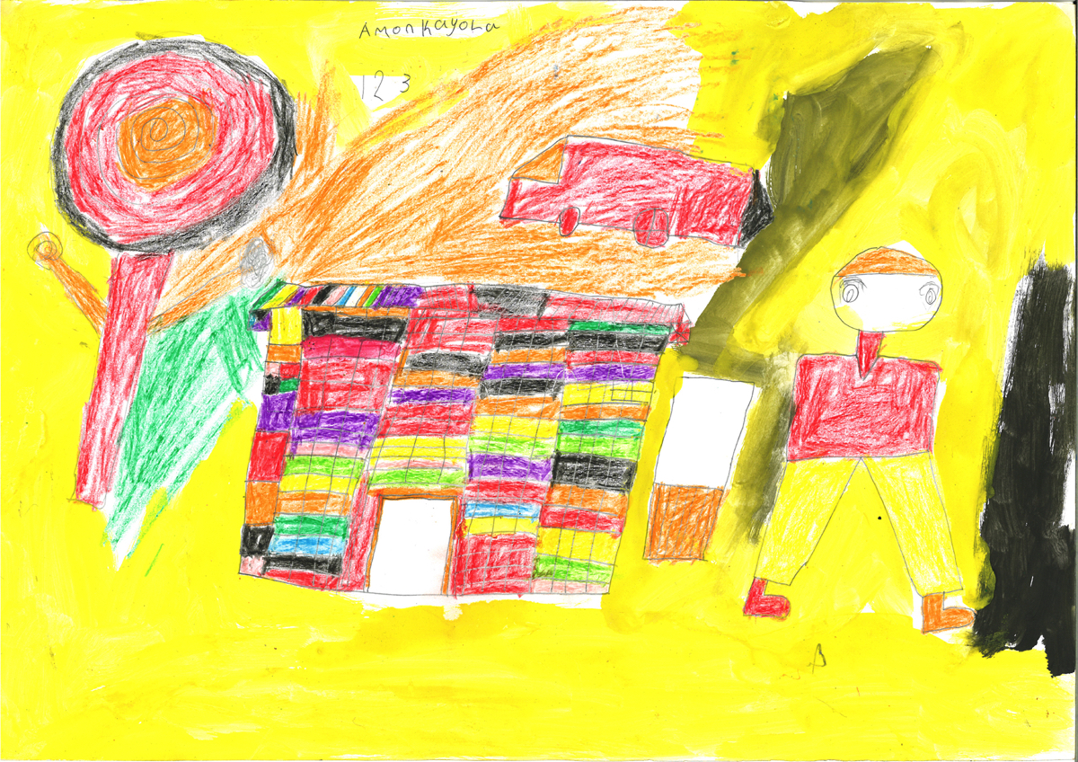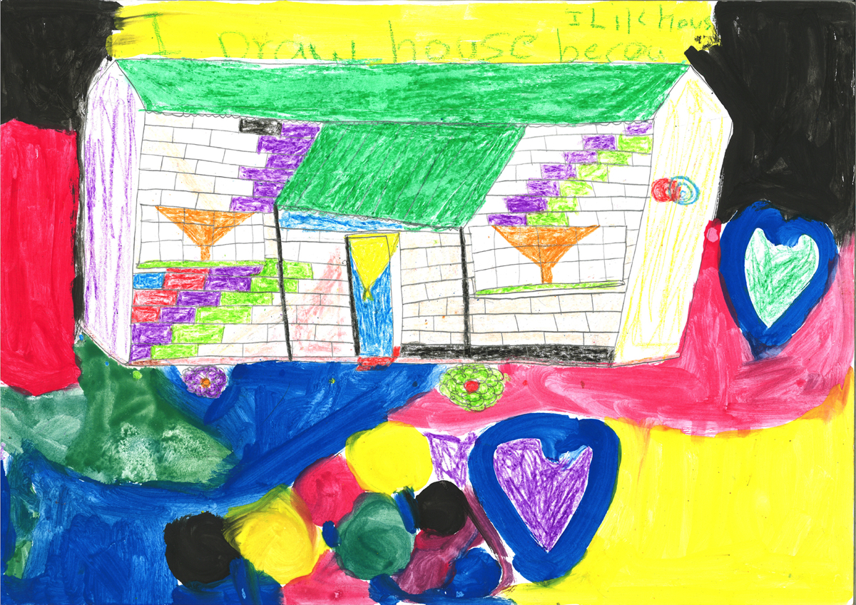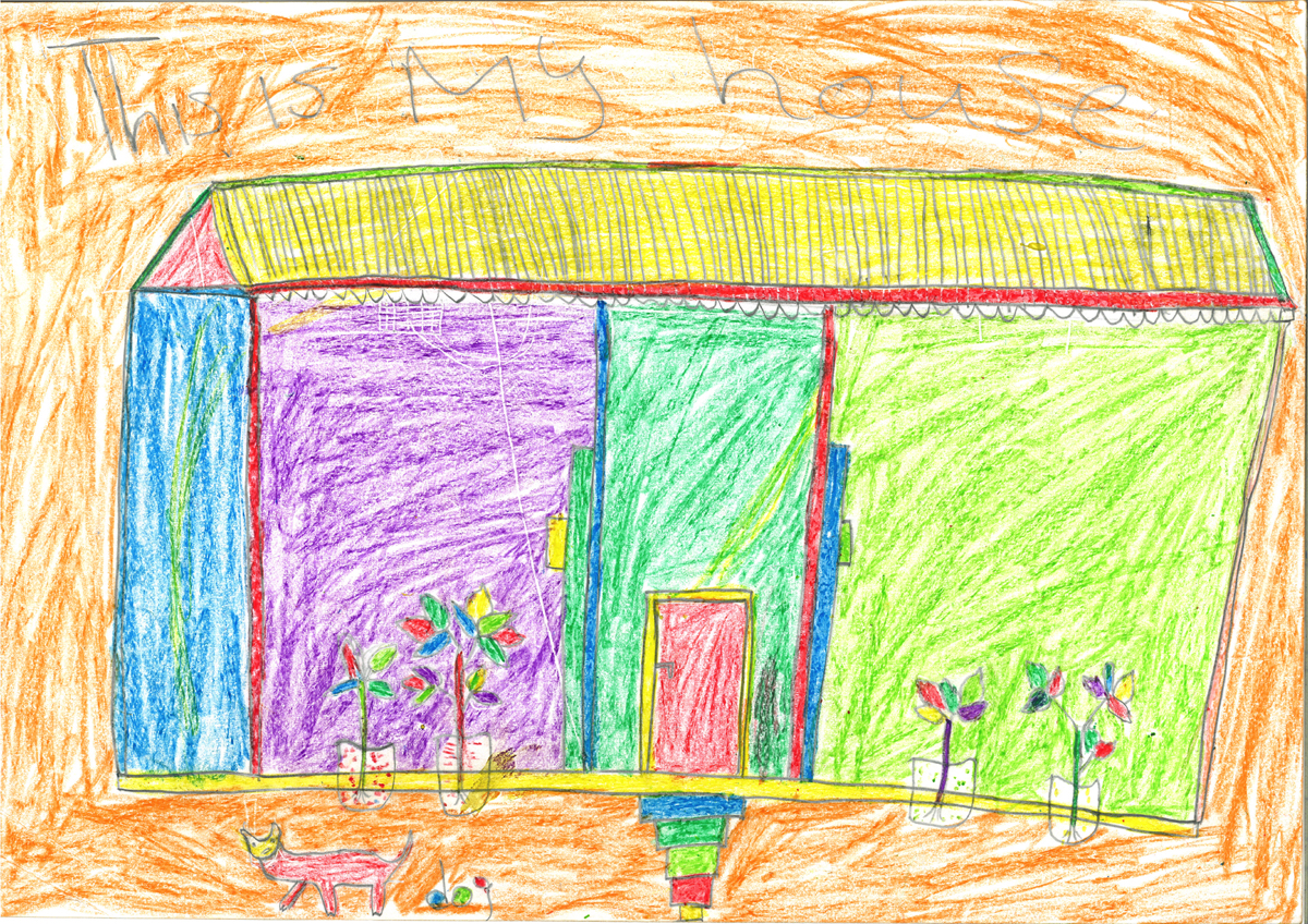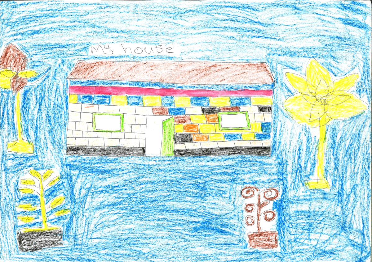 ザンビアの、自国から逃れてきた難民の子どもたちが家族や友達という「人」を描くことが多いのに対し、やっと定住できた子どもたちが「家」を多く描いていることも興味深いです。