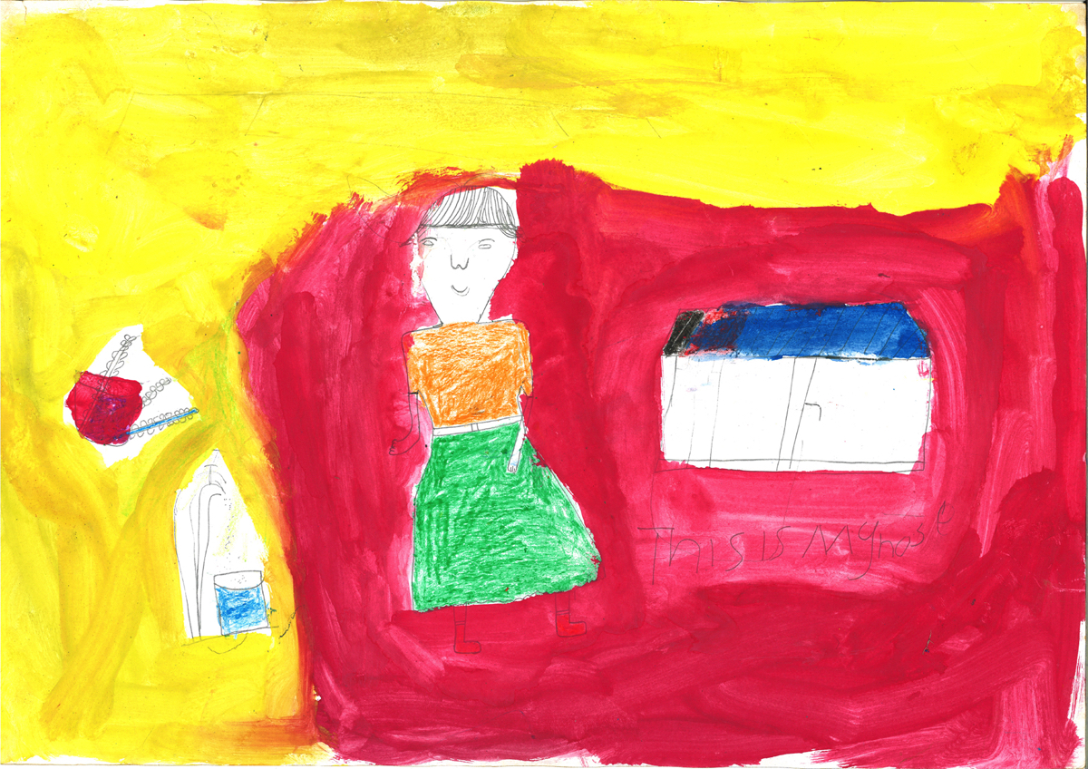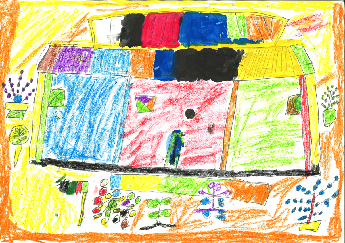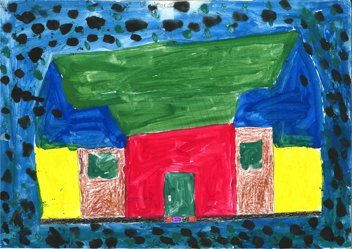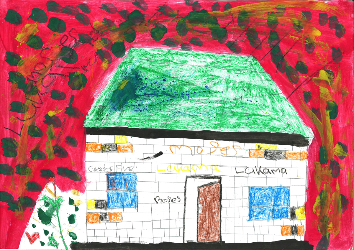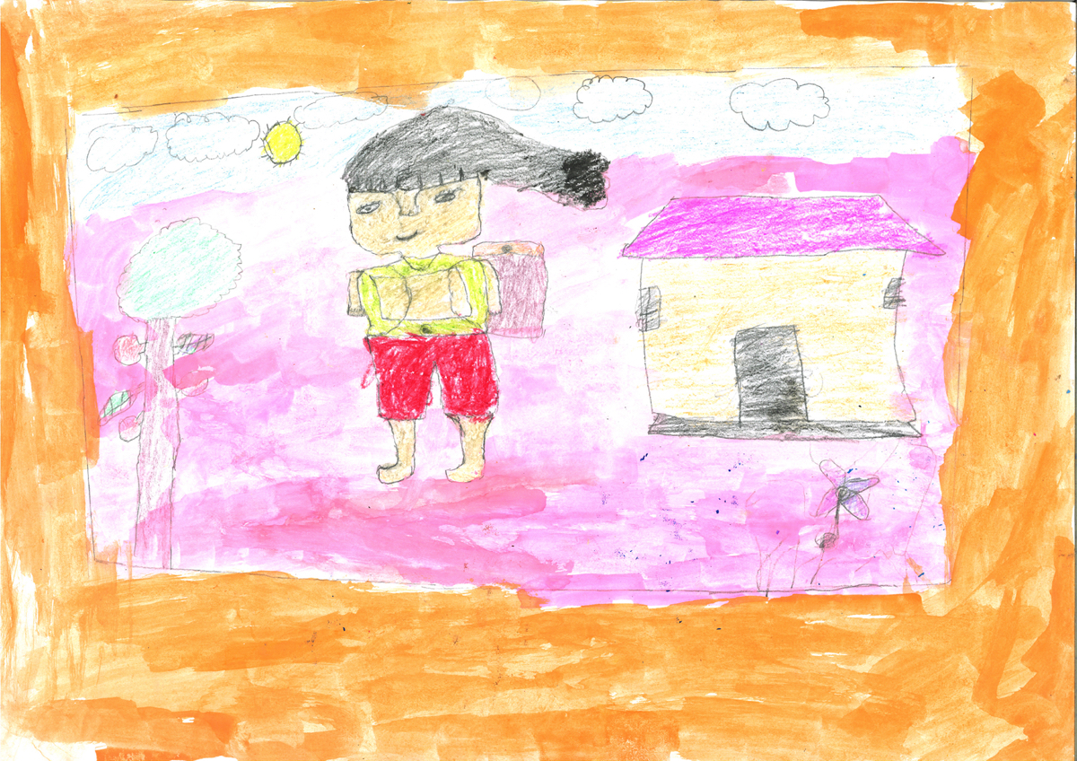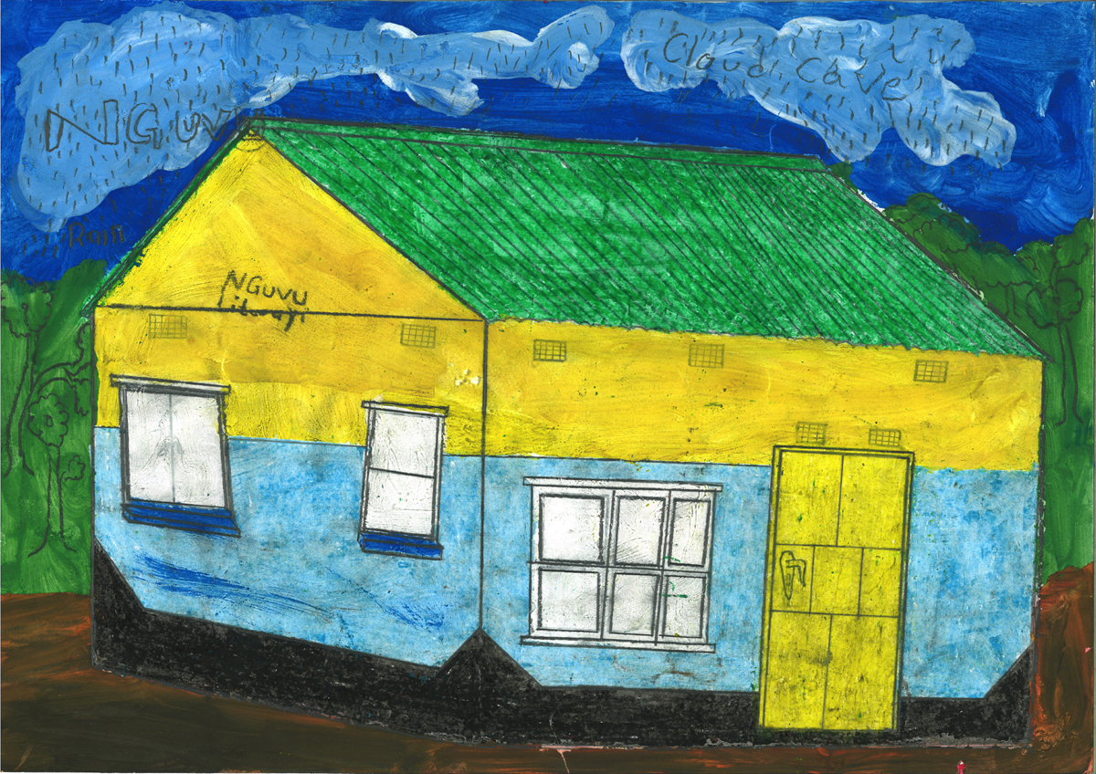 ザンビアの、自国から逃れてきた難民の子どもたちが家族や友達という「人」を描くことが多いのに対し、やっと定住できた子どもたちが「家」を多く描いていることも興味深いです。