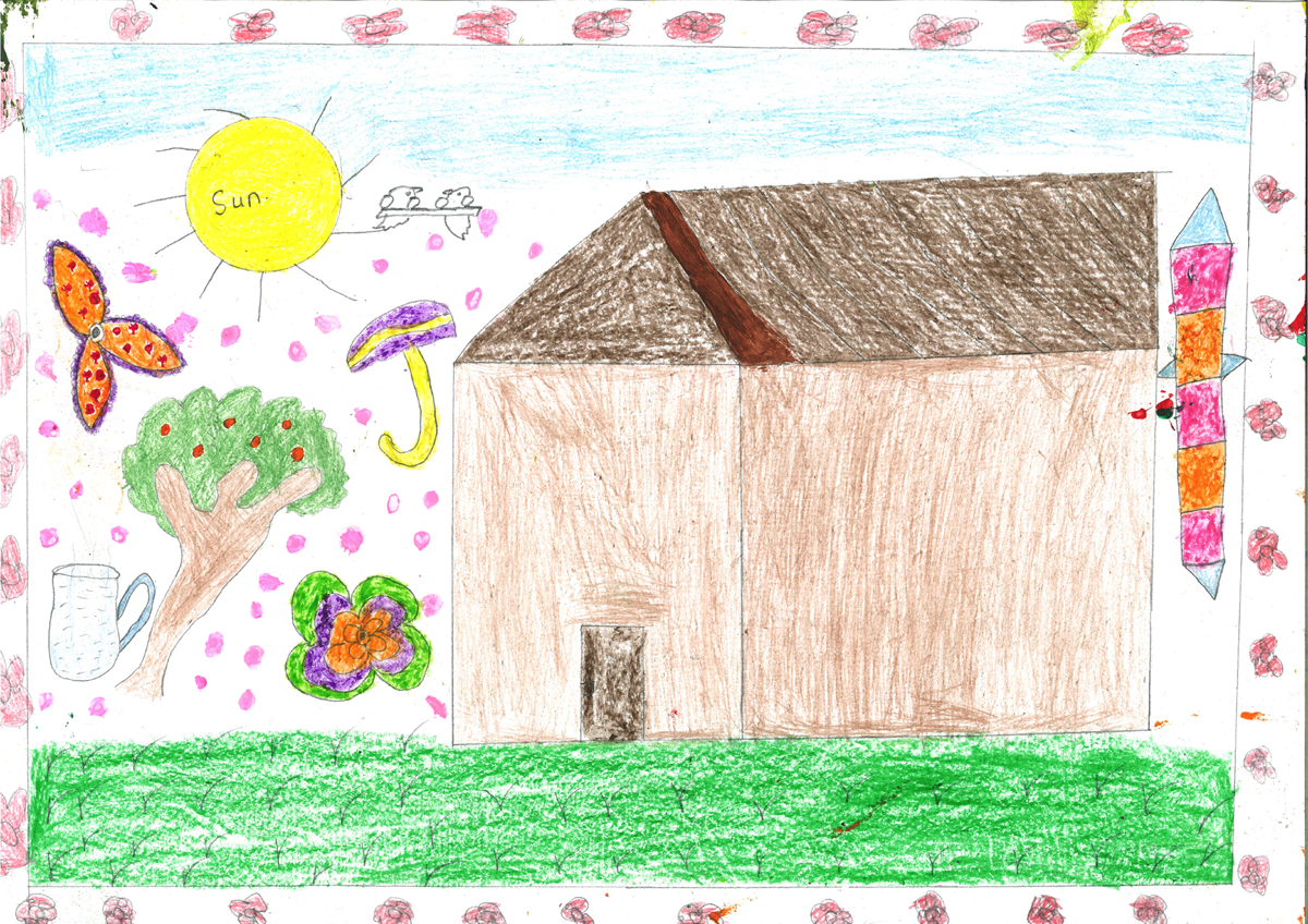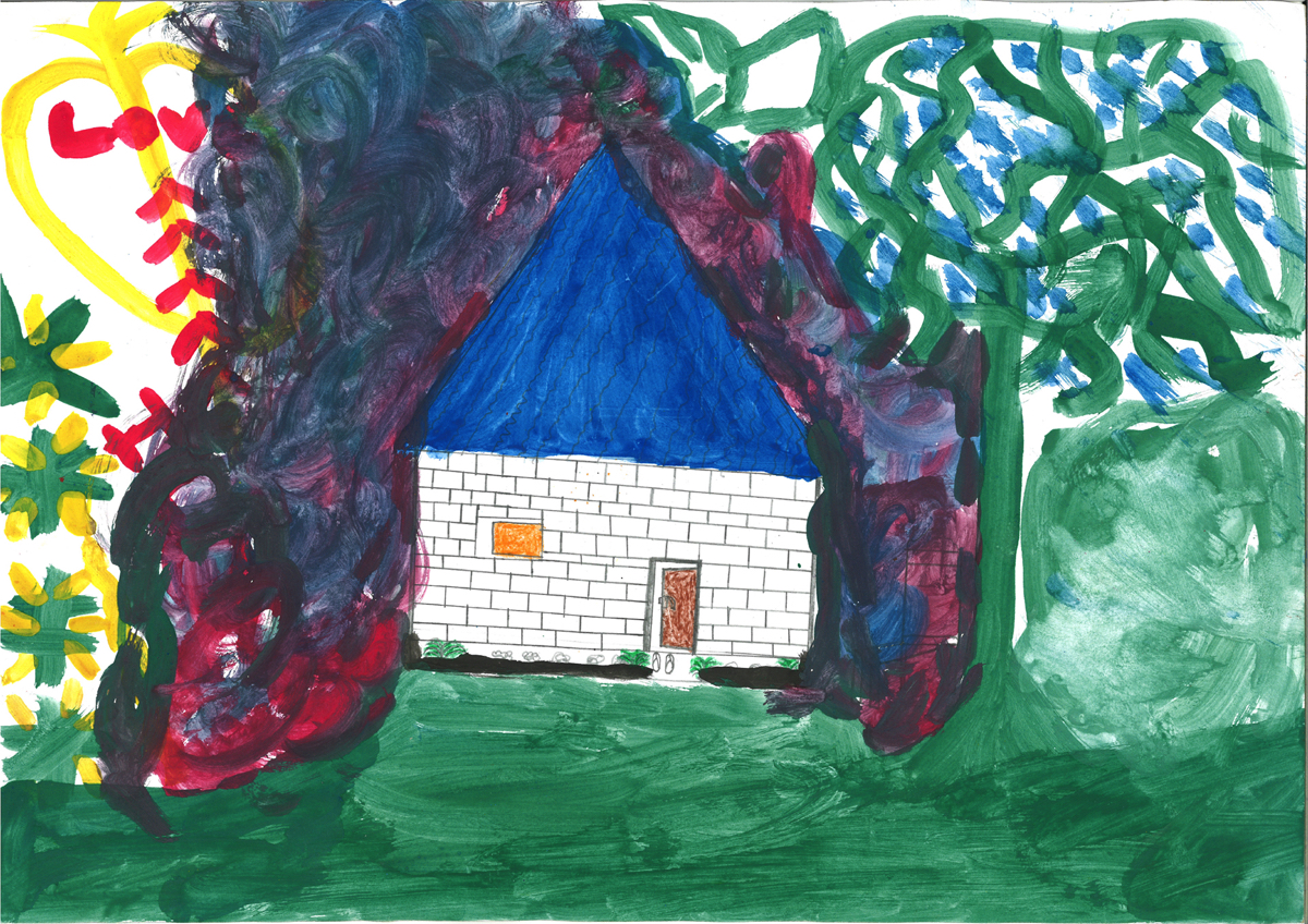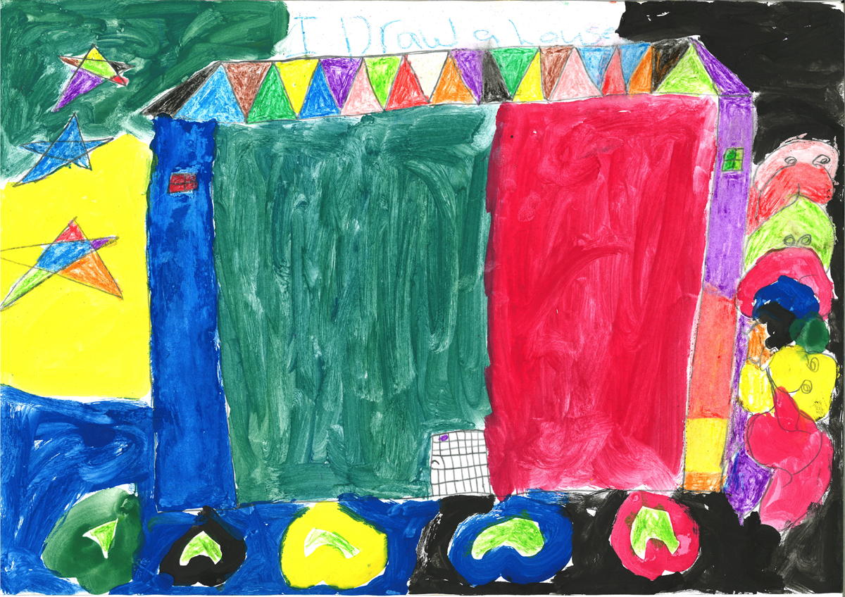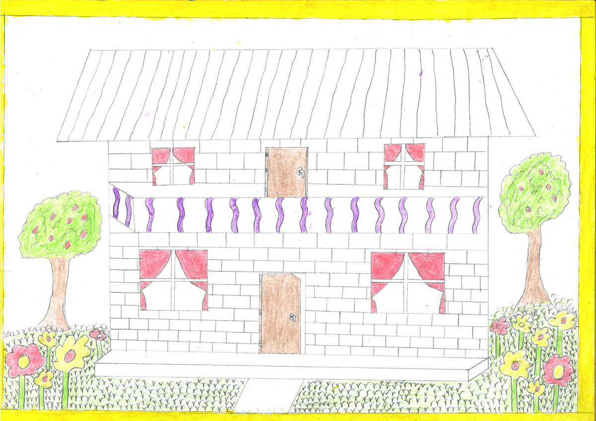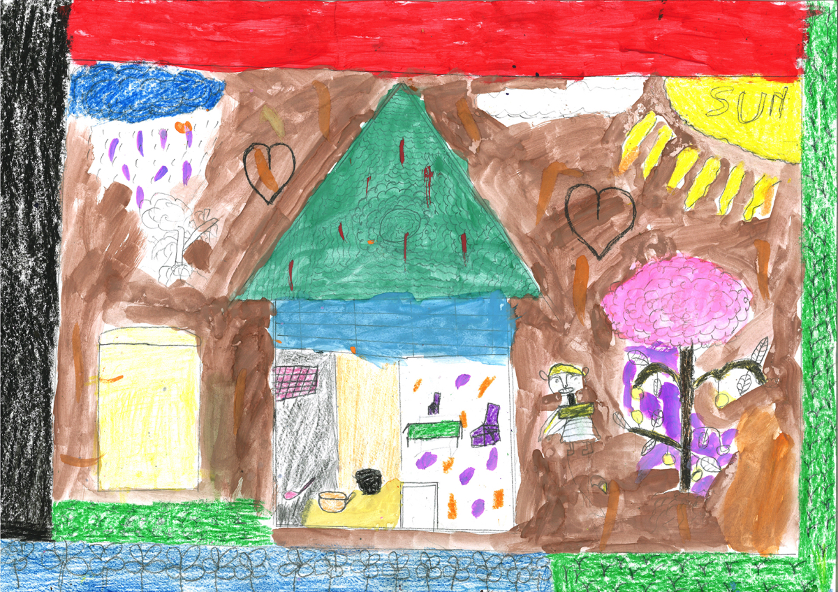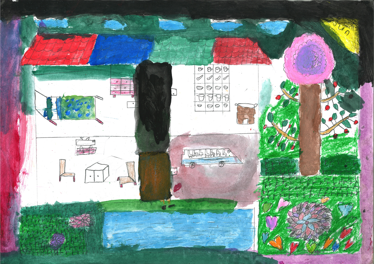 ザンビアの、自国から逃れてきた難民の子どもたちが家族や友達という「人」を描くことが多いのに対し、やっと定住できた子どもたちが「家」を多く描いていることも興味深いです。