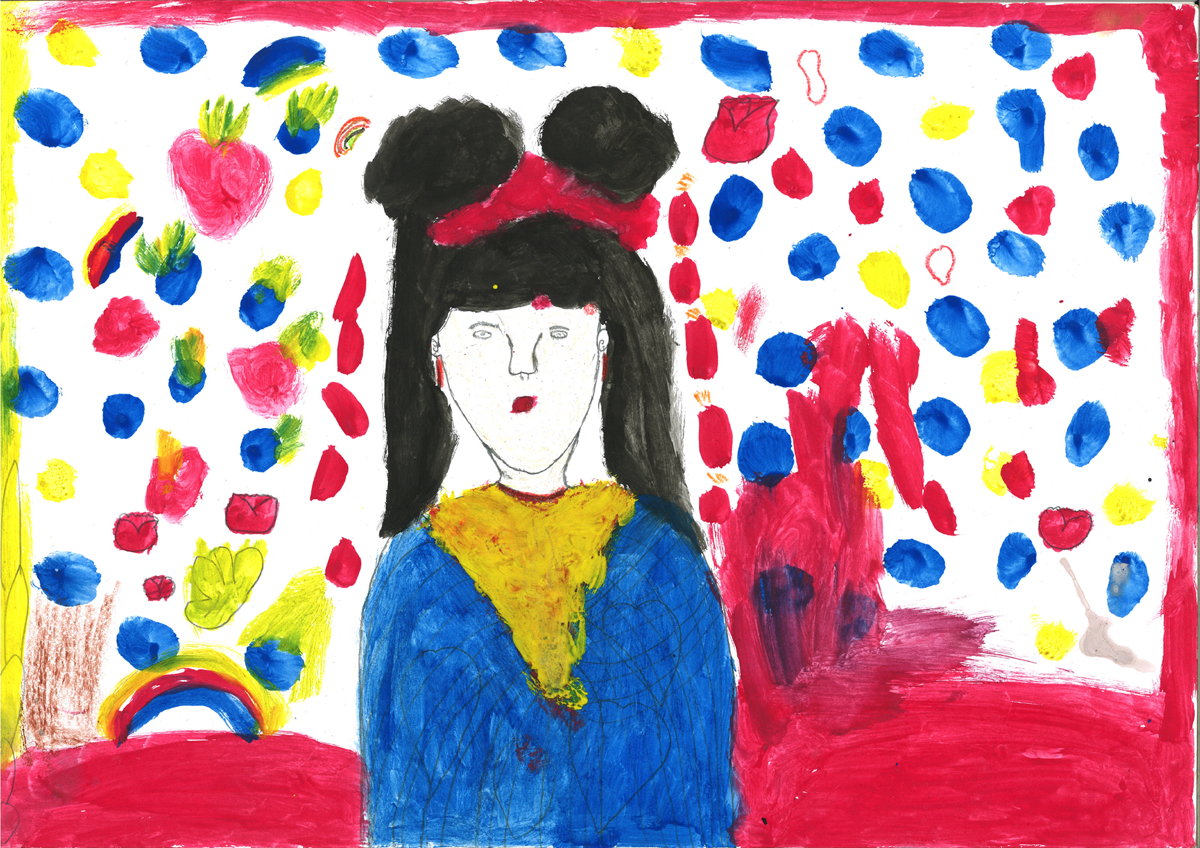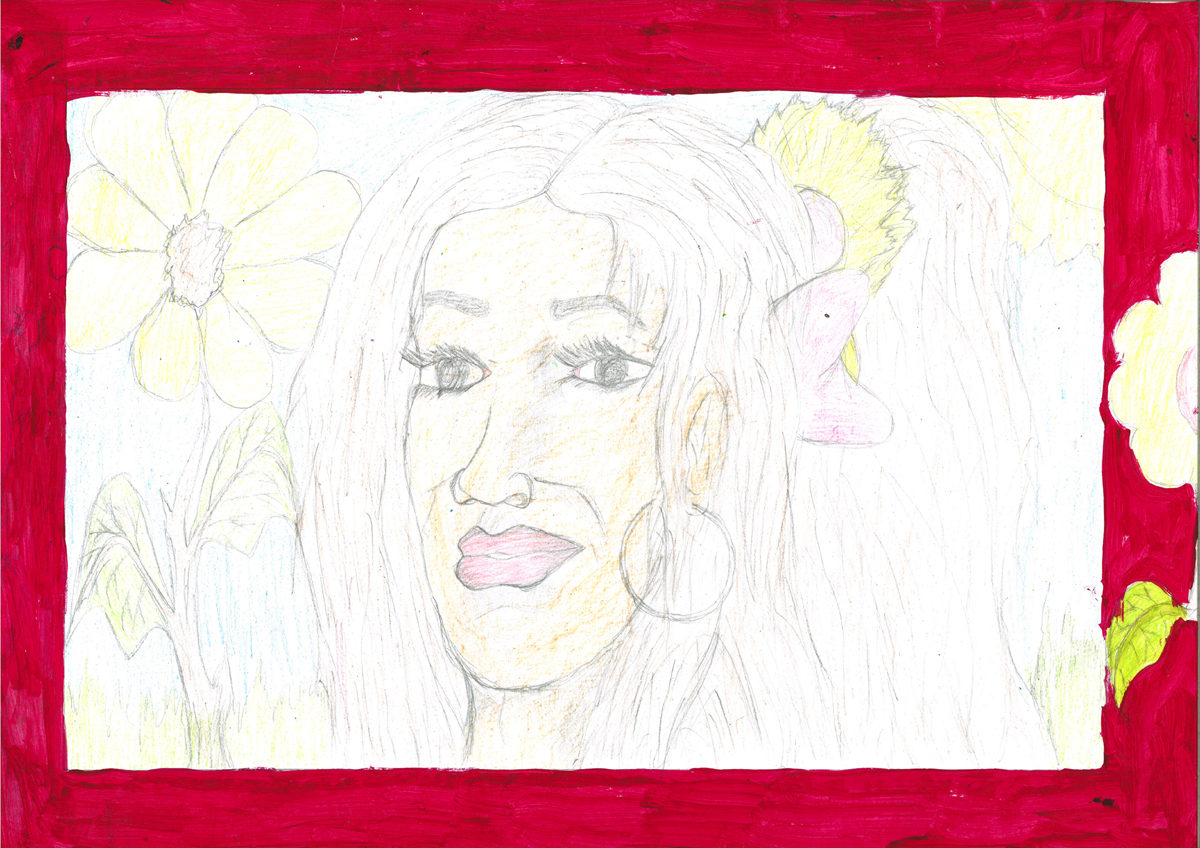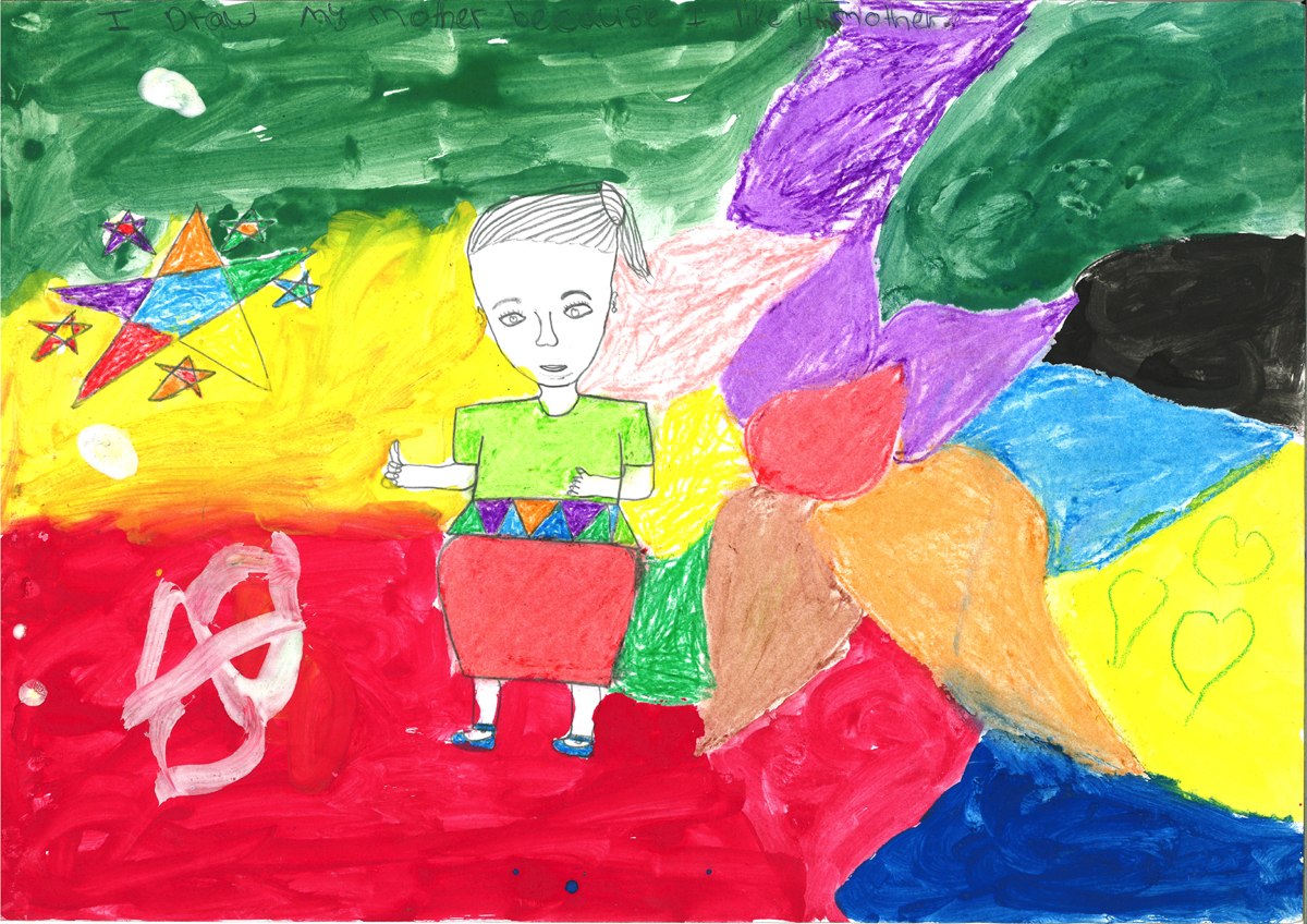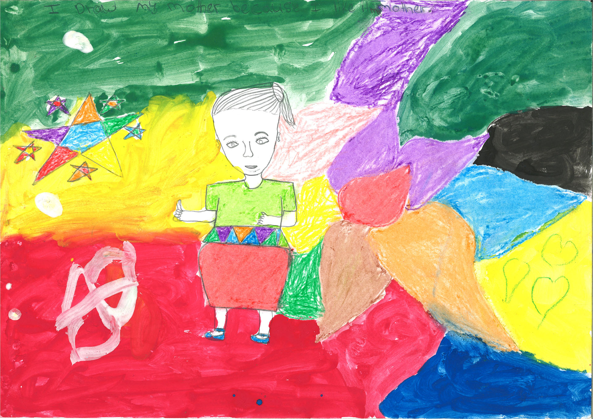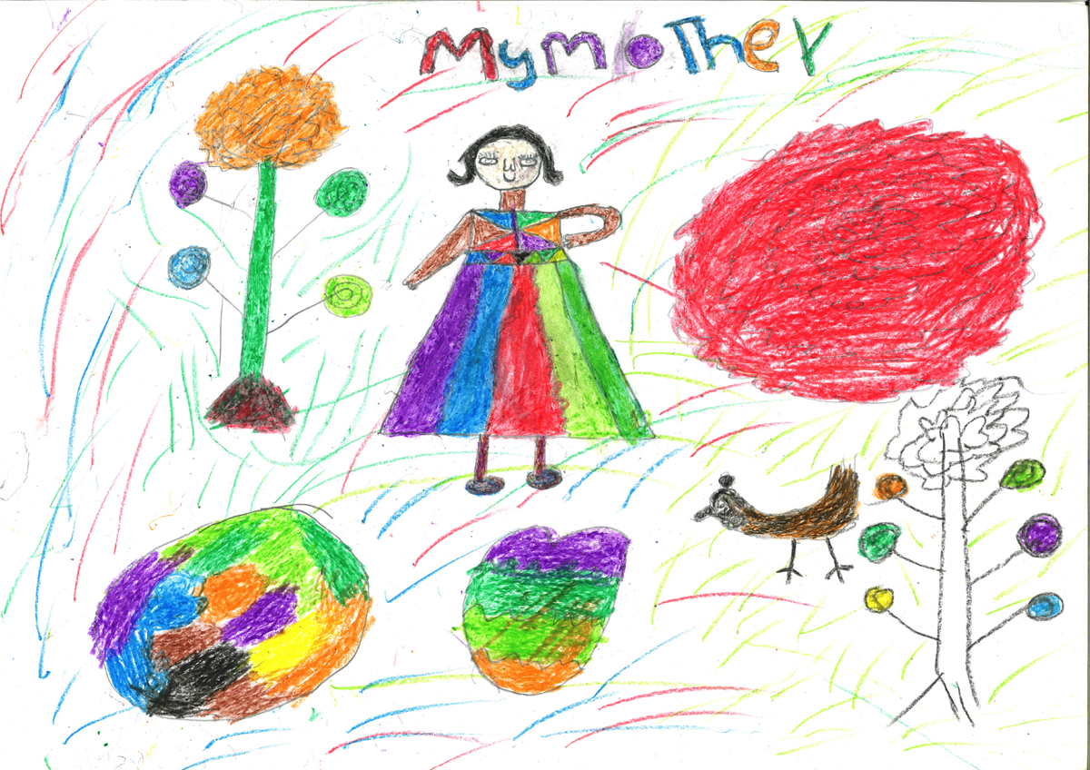 お母さんがポーズしているのも何だか素敵だし、お花や鳥、お母さんを取り囲んでいるものの描き方も可愛いくて、大切な人を丁寧に描いてくれたんだなと思いました。