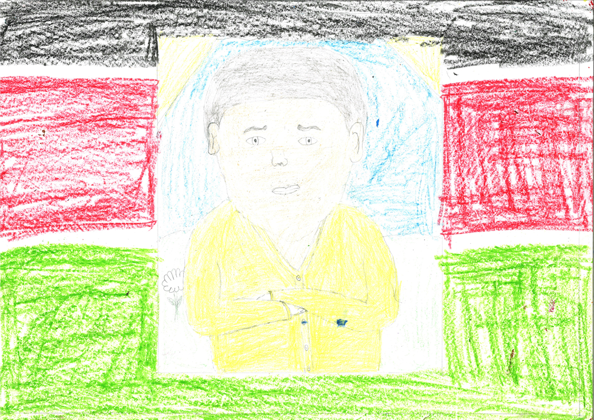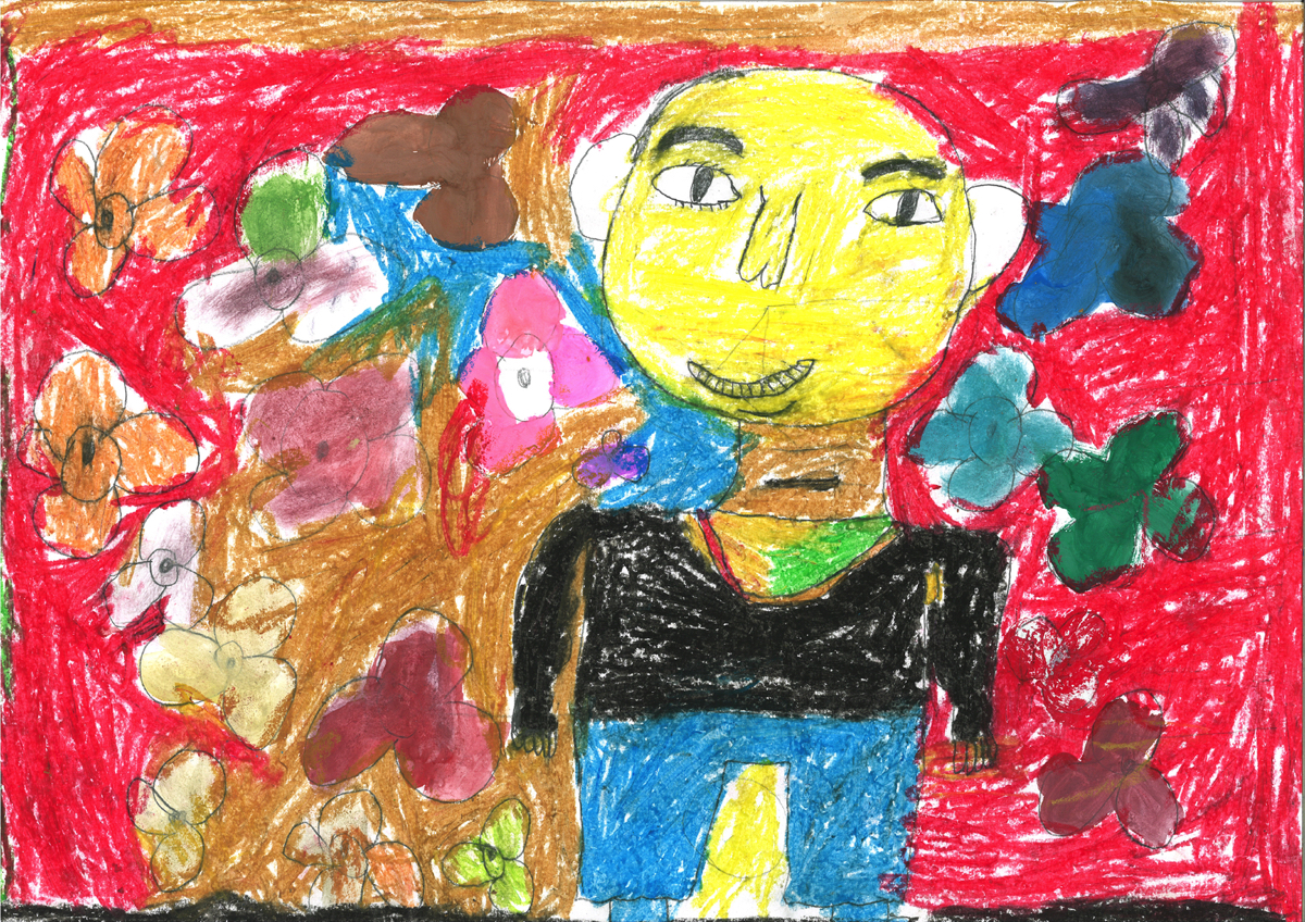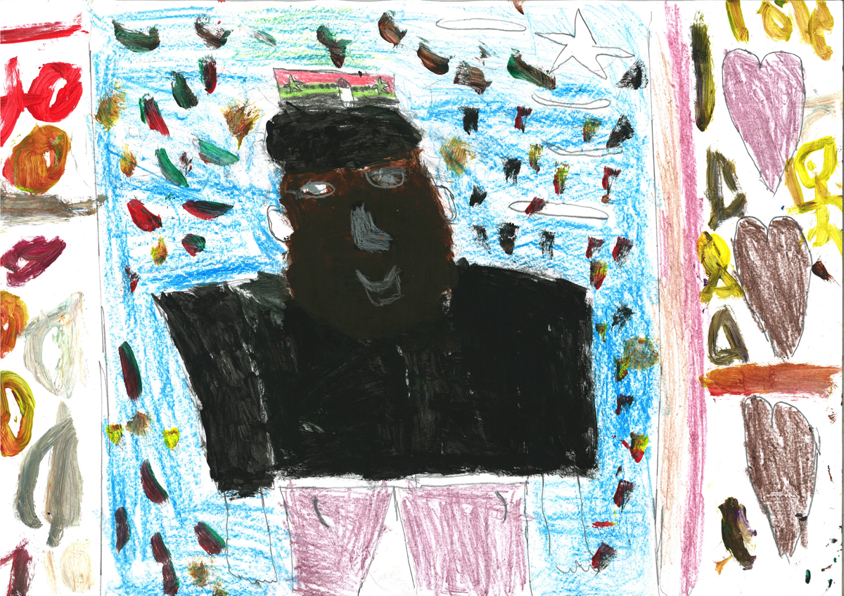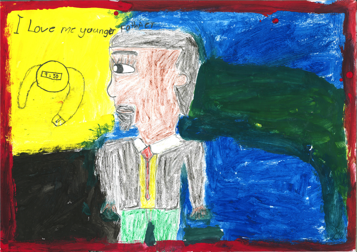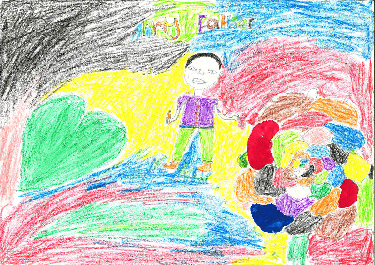 背景の下の枠が緑なのは、何かフェンスとか、外側からお父さんをのぞきながら描いたのかな?など想像しながら選びました。